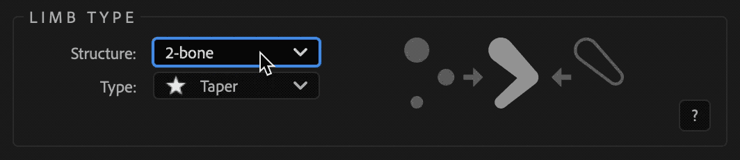 In the New Limb panel, you'll see a Structure dropdown set to either 2-bone or 3-bone. The icons to the right, and the Indicators and Artwork sections will adapt as you change the dropdown.